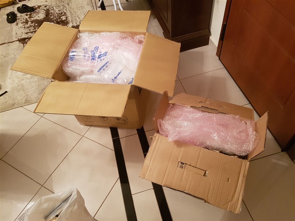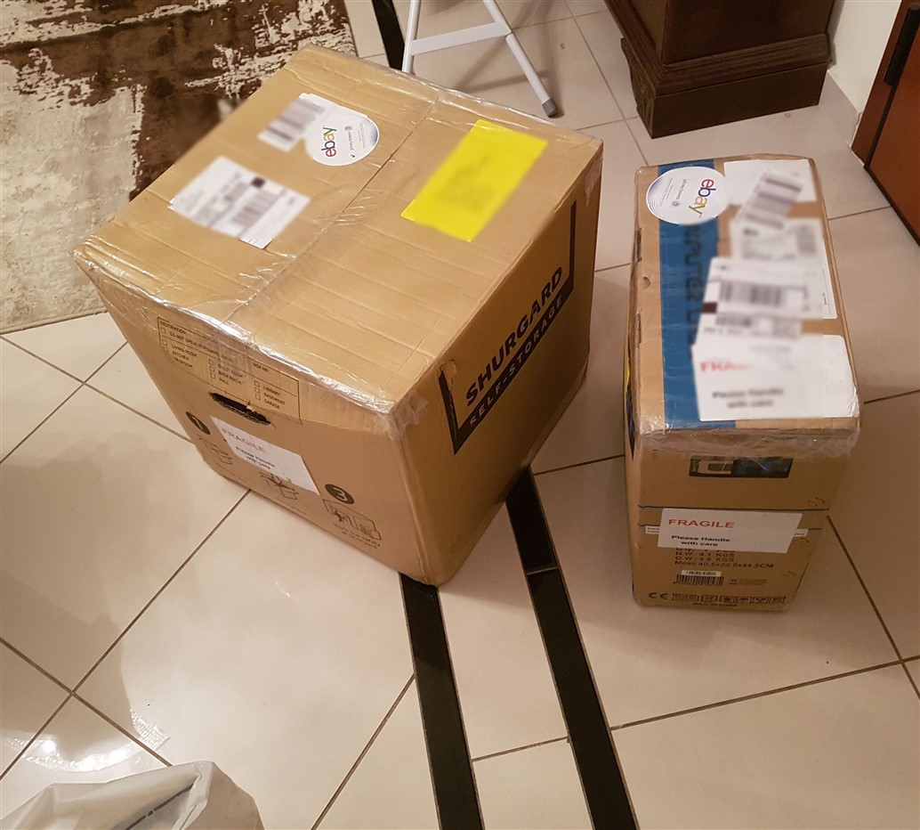 Έτσι πριν λίγες μέρες χτύπησε το κουδούνι και ακούω "Από UPS είμαστε, έχετε ένα δέμα". Δεν θυμάμαι πώς κατέβηκα τα σκαλιά και βλέπω όλο χαρά 2 μεγάλες κούτες να με περιμένουν. Δεν μπορούσα να τα πάω στο retro room εκείνη τη στιγμή καθώς από τη βιασύνη μου δεν πήρα τα κλειδιά και σκέφτηκα προς στιγμή να άφηνα τις κούτες στην είσοδο της πολυκατοικίας για ένα λεπτό μέχρι να ανέβαινα να έπαιρνα από το σπίτι τα κλειδιά, αλλά λόγω των περιπετειών και λόγω όλων των ευτράπελων που είχα πάθει σε όλες τις προσπάθειες να αποκτήσω αυτό το μηχάνημα είπα "Άκυρο, είμαι τόσο γκαντέμης με αυτό το μηχάνημα που και για ένα λεπτό μόνο να το αφήσω μπορεί να μπει κάποιος να το βουτήξει (για να συνεχιστεί το αρνητικό κάρμα - εδώ το είχα πληρώσει, το είχα πάρει αγκαλιά να φύγω και η άλλη στο τηλέφωνο είπε ξαφνικά ότι δεν το δίνουν!!! )
