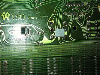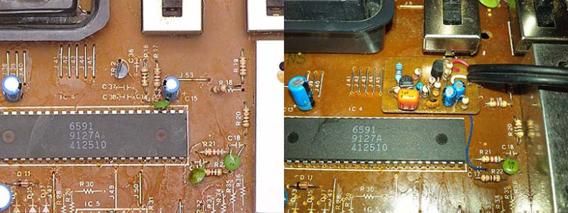 Αυτά που έγιναν, ήταν να φταχτεί μια μικρή πλακέτα με τους δύο ενισχυτές, βίντεο και ήχου, και να κολληθεί σε υπάρχουσες τρύπες στην πλακέτα. Αφού πια έχουμε composite, αποσύνδεσα τα κυκλώματα του modulator για να γλυτώσουμε λίγη κατανάλωση, ίσως και παρεμβολές στο βίντεο. Μπήκε ψύκτρα στο 7805, τον σταθεροποιητή τροφοδοσίας, που το χρειαζόταν πολύ! Επίσης σύνδεσα και έναν πυκνωτή στον διακόπτη που αλλάζει παιχνίδια και τώρα αλλάζει ένα παιχνίδι σε κάθε πάτημα, ενώ άλλαζε 3-4!