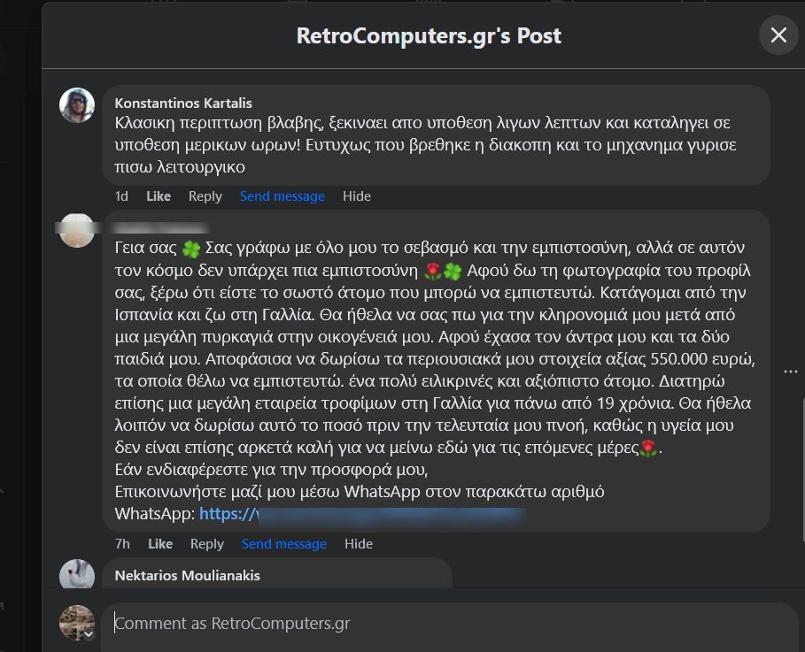 Σας παραθέτω screenshot από το σχόλιο το οποίο και διέγραψα από το Facebook αλλά "θόλωσα" και το ονομα και τα στοιχεία επικοινωνίας της γυναίκας που μας δωρίζει την κληρονομιά της για να μην της στείλει κάποιος άλλος και μας πάρει τα 550.000 ευρώ!!!!