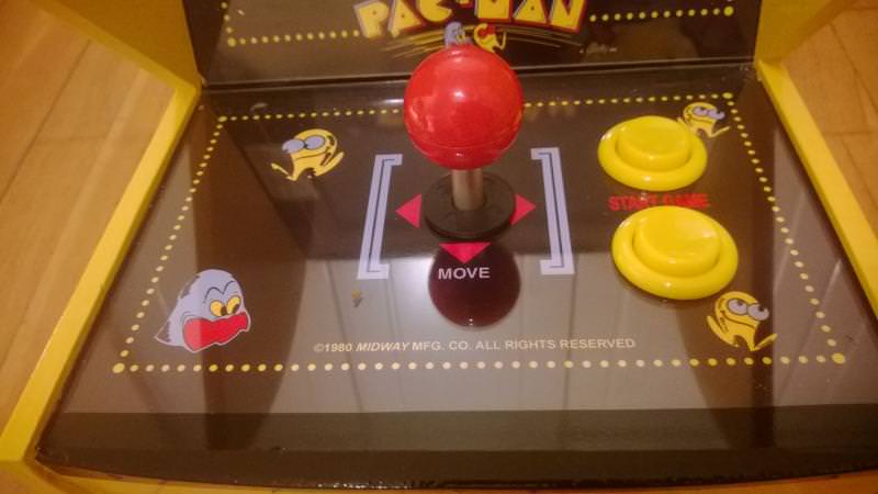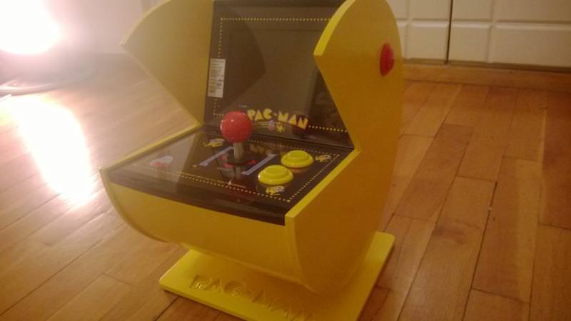 Να σας πω και δυο λόγια για την κατασκευή ..Τα κομμάτια σχεδιάστηκαν σε CAM πρόγραμμα και τα ξύλα κόπηκαν σε CNC μηχανή, η βαφή είναι 3 στρωμάτων (βάση, χρώμα, βερνίκι) ,Το Hardware είναι οθόνη 7'' με AV out και το joystick είναι τις Namco 10 σε 1 παιχνίδι με TV out και Audio out. To joystick 'γδύθηκε' μέχρι πλακέτας για μπει στην κατασκευή όπως το ίδιο και η οθόνη.Η τροφοδοσία του είναι 5/12v (5v για το πακμαν και 12v για την οθόνη) εξωτερικό τροφοδοτικό για σκληρούς δίσκους 2A με βύσμα molex.