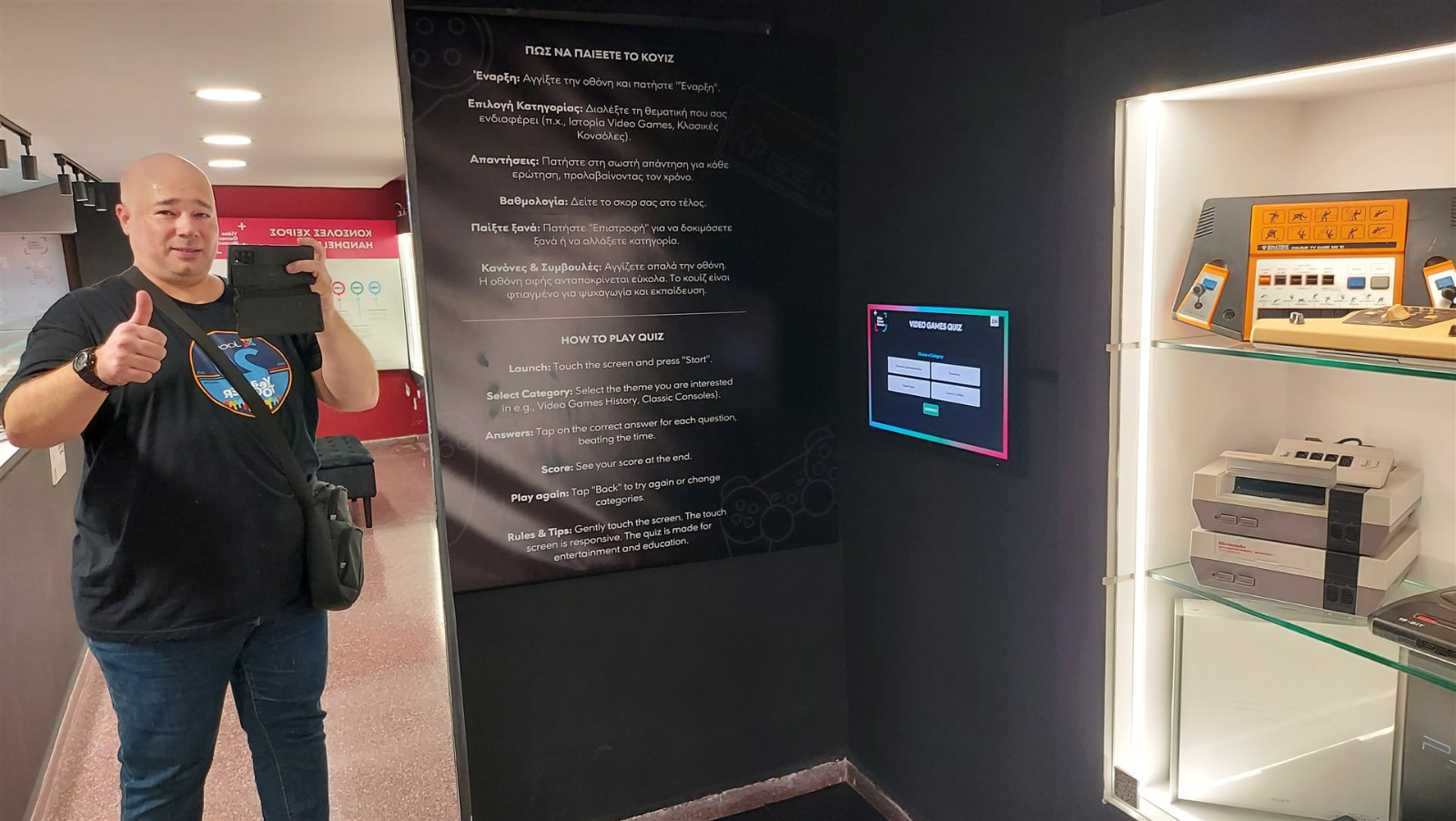 Ξεκίνησα από το υπόγειο, μετά στο ισόγειο και μετά στον πρώτο όροφο. Η δουλειά που έχει γίνει είναι πάρα πολύ καλή και φαίνεται ξεκάθαρα ότι υπάρχει αγάπη και μεράκι για όλα αυτά που έχουν γίνει. Πολλές κονσόλες από τα 70s μέχρι και τη σημερινή εποχή, όμορφες βιτρίνες, φωτισμοί, πολλές οθόνες για ενημέρωση, διάφορα σημεία με συγκεκριμένες θεματολογίες, πολύ ωραία διακόσμηση με αφίσες, artwork και με πολλά ρετρό αντικείμενα που ταίριαζαν και έδεναν απόλυτα με το χώρο.