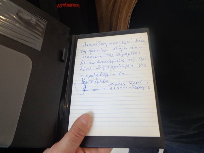 Επίσης κάτι που μας έκανε μεγάλη εντύπωση και μας χαροποίησε ήταν όταν ένας επισκέπτης της έκθεσης, ο συγγραφέας κ. Μιχάλης Χαλάς μας έδωσε συγχαρητήρια και έγραψε σε ένα χαρτί ένα κείμενο για την έκθεσή μας και μας το έδωσε όπως μπορείτε να δείτε παρακάτω. Πραγματικά τον ευχαριστούμε πολύ και είναι τιμή μας να παίρνουμε από τέτοιους μορφωμένους ανθρώπους συγχαρητήρια!