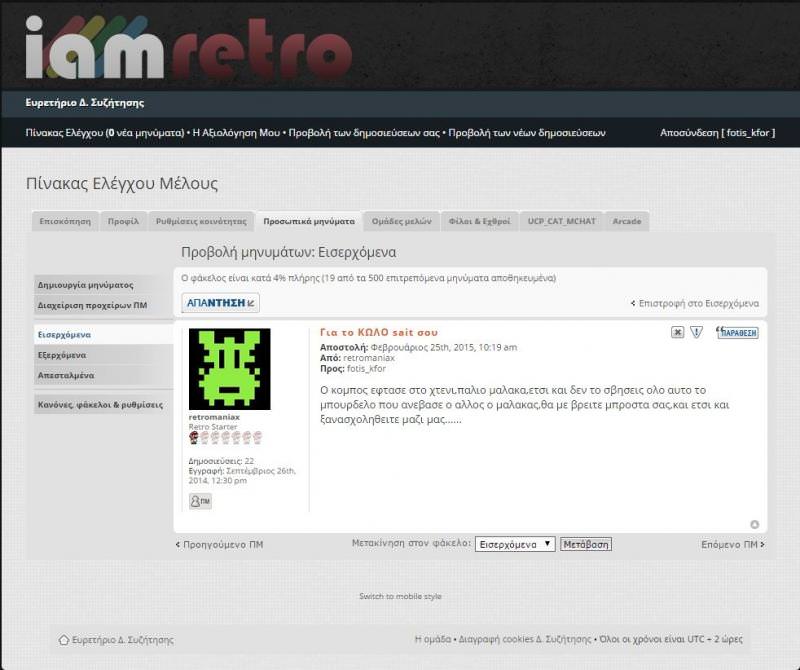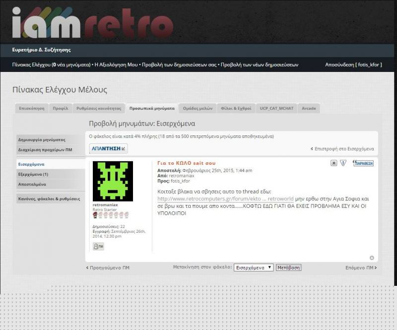 Έκανα login μετά από 2 μέρες σχεδόν που τρέχω με δουλειές , στο νοσοκομείο που έκανε εγχείρηση συγγενικό μου πρόσωπο και διάφορα άλλα τρεξίματα και υποχρεώσεις που έχω και μπαίνοντας στο iamretro είδα με έκπληξη ότι έχω λάβει 2 PMs απειλητικά από τον χρήστη retromaniax και αργότερα και ένα τρίτο :