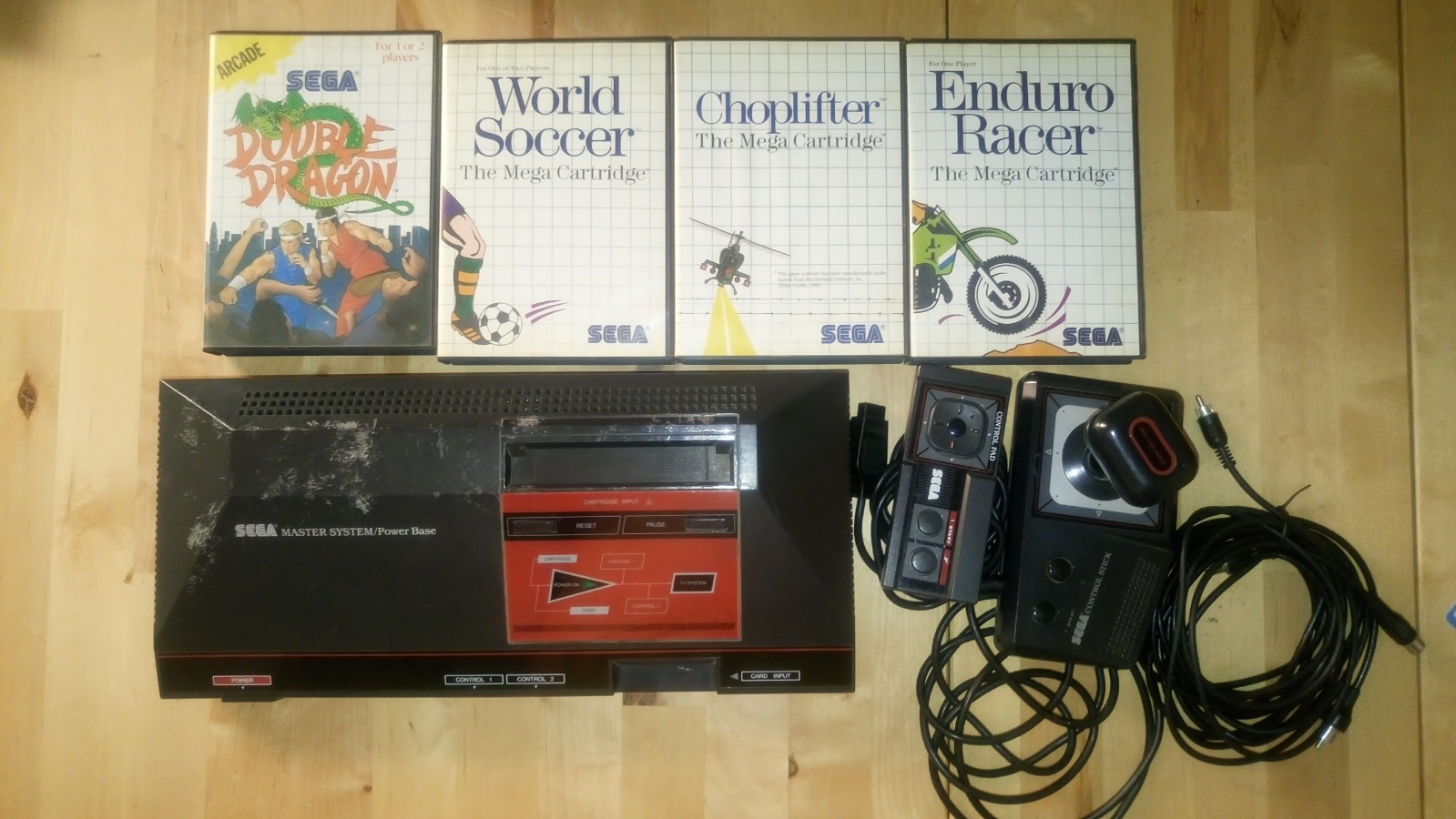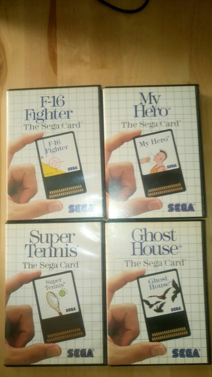 Το Sega Master System καθαρισμένο και πλήρως λειτουργικό (έχει γρατσουνιές στο καπάκι του) μαζί με: 1 κλασικό χειριστήριο, 1 χειριστήριο joystick (πλήρως λειτουργικά και καθαρισμένα και τα 2) και καινούριο power supply (όχι αυθεντικό). Μαζί δίνω και τα καλώδια για σύνδεση με τηλεόραση και το κλασικό antenna-console switch. Μαζί του θα πάρετε και 14 παιχνίδια (10 cartridges και 4 sega cards. Τα 13 είναι τεσταρισμένα και λειτουργούν ενώ το F16 fighter δουλεύει όποτε του κατέβει. Όλα τα παιχνίδια έχουν κουτί ενώ 10 από αυτά έχουν και το manual. Δεν έχουν manual τα 4 που εμφανίζονται στη φωτογραφία μαζί με την κονσόλα. Τιμή 150€.