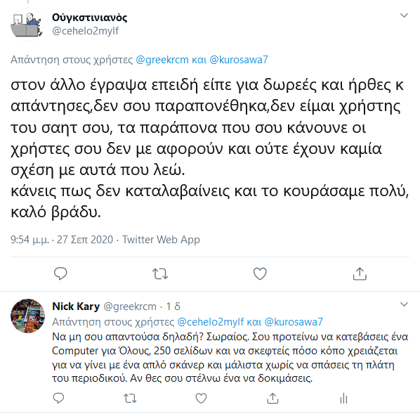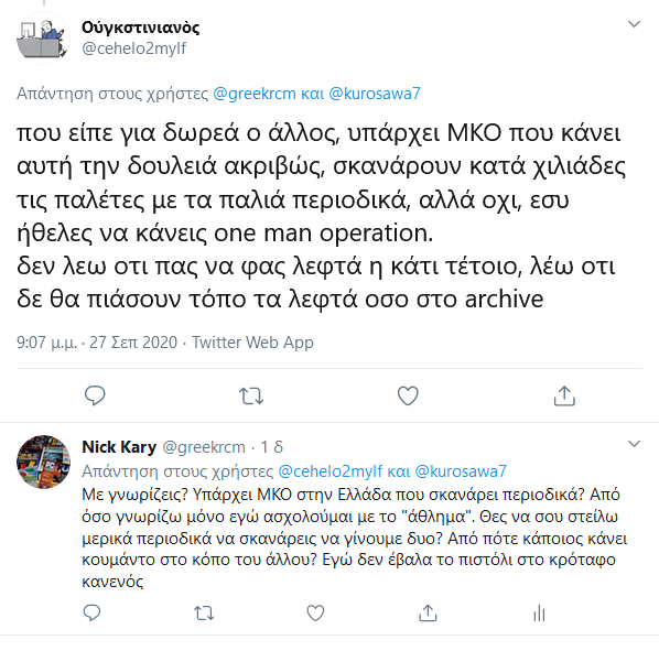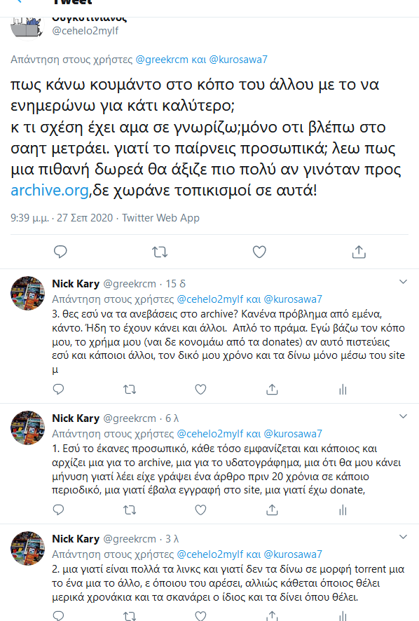 Έχεις αναφέρει και εδώ και στα κοινωνικά δίκτυα ότι εσύ που κάνεις τον κόπο να σκανάρεις τα περιοδικά έχεις αποφασίσει να τα έχεις σε ένα site να είναι όλα εκεί μαζεμένα - τακτοποιημένα και όποιος θέλει κάνει ένα login και να τα κατεβάζει. Έτσι είναι. Απλά. Δεν γουστάρεις ούτε να τα βάλεις σε torrent ούτε να τα δίνεις με άλλους τρόπους που σου λένε, ούτε σε......ΜΚΟ να τα δώσεις....ούτε στη... Unicef.