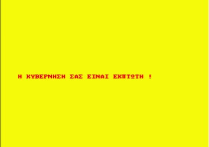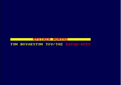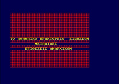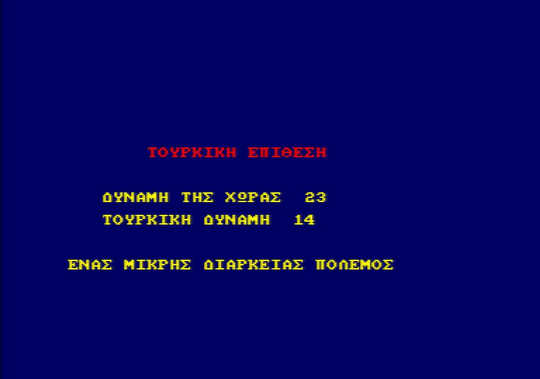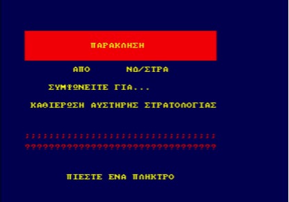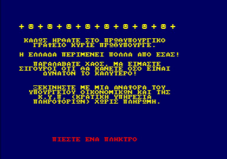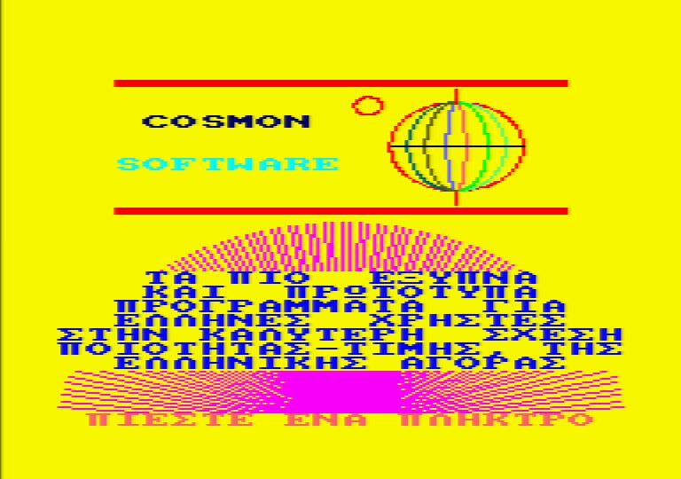 Στην πρώτη οθόνη (μετά το σήμα της Cosmon) το παιχνίδι μας καλοσορίζει με τον τίτλο και μια Ελληνική σημαία σε ascii μορφή.