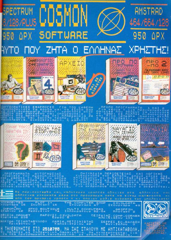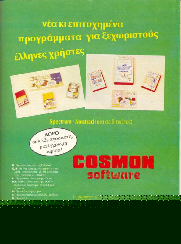 Βασικός προγραμματιστής της, εκείνος δηλαδή που ανέπτυξε όλα τα παιχνίδια και προγράμματα στις πλατφόρμες των 8bit ήταν ο Γιώργος Ηλ. Αράπογλου. Σ'αυτο το σημείο, οφείλω λοιπόν να ευχαριστήσω την Cosmon Software και ιδιαιτέρως τον κ. Γιώργο Ηλ. Αράπογλου γιατί μέσα απο τα προγράμματα του μου δίδαξε κάποιες βασικές τεχνικές προγραμματισμού.
