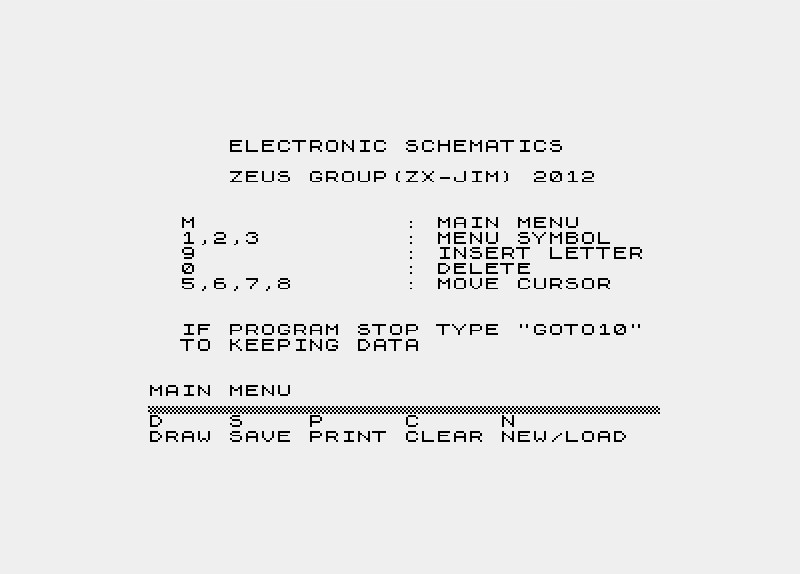 Από εδώ όπως και στον ZX81 μπορούμε να μπούμε στο κεντρικό πρόγραμμα και να αρχίσουμε τη σχεδίαση, να φορτώσουμε ή να σώσουμε ένα αρχείο ή να ξεκινήσουμε ένα νέο σχέδιο.