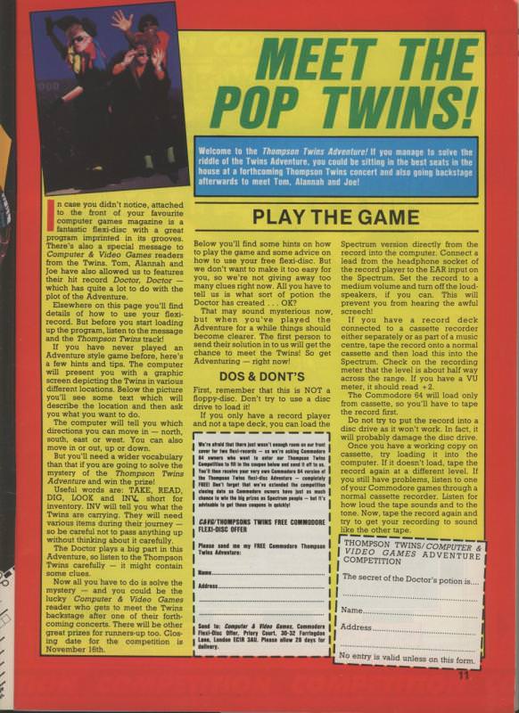 Με πιό γνωστές επιτυχίες τους τα τραγούδια "In The Name Of Love", "Lies", "Doctor Doctor" και "King For A Day" ήταν ανάμεσα στα ελάχιστα ποπ γκρούπς των '80s(συμπεριλαμβανομένων των Journey, Frankie Goes To Hollywood και The Stranglers), που είχαν τα δικά τους βιντεοπαιχνίδια(!). Τι το ξεχωριστό είχε η περίπτωση των The Thompson Twins? Το παιχνίδι τους "The Thompson Twins Adventure" από την Quicksilva, ερχόταν δωρεάν σαν cover-disc σε 7'' δίσκο βινυλίου flexi-disc(!) στο τεύχος 36 του περιοδικού Computer & Video Games magazine με ημερομηνία Οκτώβριος 10/84. Στον δίσκο αυτό, μαζί με το παιχνίδι για το ZX Spectrum, υπήρχε γραμμένο και ενα μηνυμα απο το συγκροτημα(καποιο καλωσόρισμα μαλλον)!